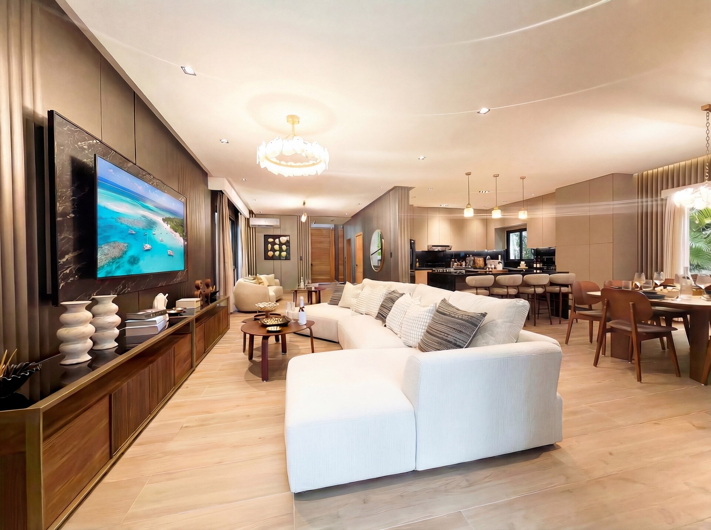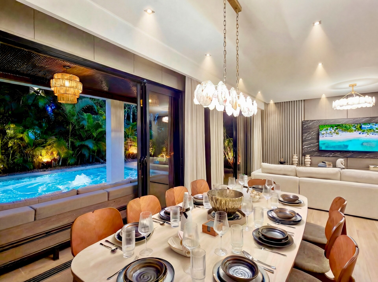 Designed across 400m² of private villa living, the space combines modern architecture with warm, high-end materials, creating an atmosphere that feels both elegant and relaxed. Expansive glass elements open the villa towards the outdoors, blending indoor and outdoor living seamlessly and filling the space with natural light, palm views, and a constant Caribbean breeze.